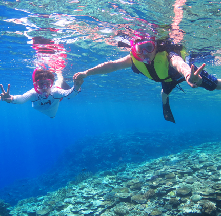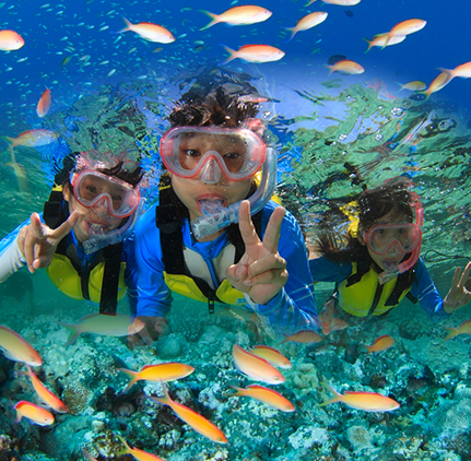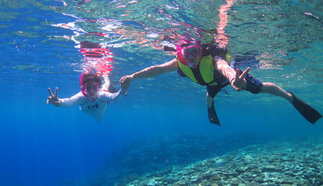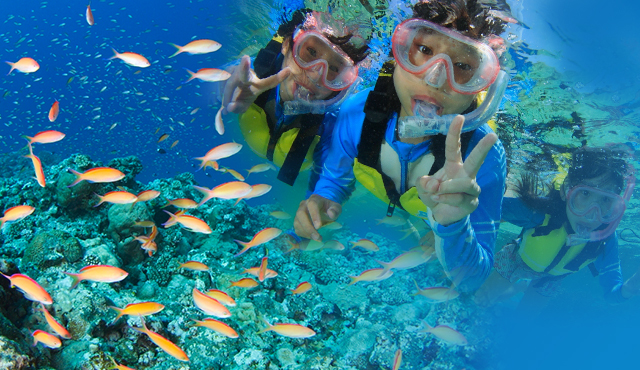 どこまでも青い海に色とりどりのサンゴや熱帯魚などが見られ、初めての人には感動間違いなし!