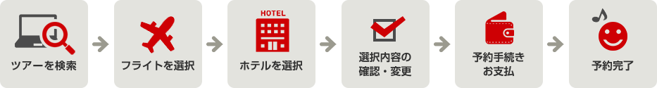 予約を入れると、その場で飛行機とホテルを確約。人気の連休や年末年始などは、満席になる前の早めに飛行機やホテルを確保することが重要です。