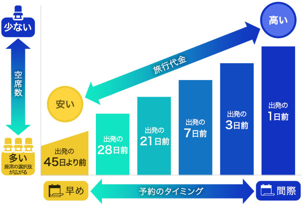 多くの航空会社やホテルがダイナミックプライシング(変動料金制)を導入しており、需要と供給のバランスによって価格が変動します。そのため、航空機の空席やホテルの空室が少なくなるにつれて、料金が上昇する傾向にあります。つまり、早めの予約が費用を抑えるポイント!例えば、JALの国内線航空券では、最も割引率が高いのは出発の75日前までの予約です。以降は、55日前、45日前、28日前といった区切りで、割引率が徐々に低下していきます。また、オリオンツアーでは、ホテルについても60日前までのご予約で早期割引料金が適用されるプランを多数ご用意。航空券とホテルをあわせて早めに予約することで、さらにお得になります。
