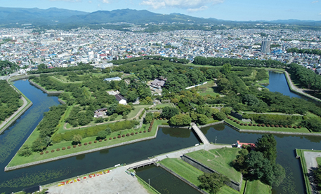 五稜郭は徳川幕府が幕末の北方防備の目的で造られた日本初のフランス築城方式の星型要塞で国の特別史跡に指定されている。五稜郭の外側に高さ107mの五稜郭タワーがあり、展望台からは五稜郭の星形や函館山、津軽海峡などが一望できる。園内は春にソメイヨシノが一勢に咲き、冬にルミネーションでライトアップされる。
