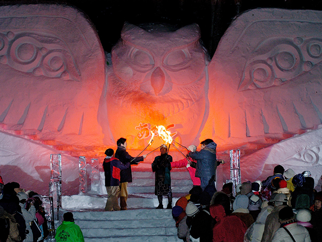 花火の前で行われるミニセレモニーはアイヌ民族の火の神が登場し、いわゆる「火の儀式」がとり行われます。氷の舞台に火が灯されカムイに祈りを捧げる神秘的な「炎のセレモニー」は必見です。