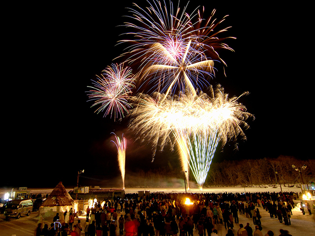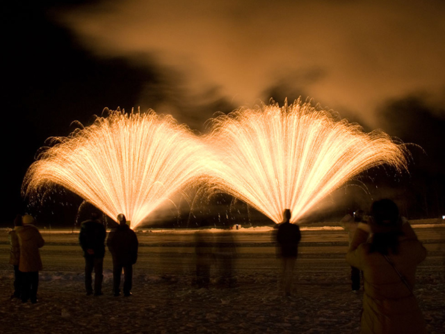 凍てつくような澄んだ空気のなか、マイナス20℃の氷点下の阿寒湖の氷上で花火を打ち上げます。暗闇に華を咲かせる真冬の花火は、見る人の心も温まる、感動的な美しさ。期間中は毎日氷上の世界を彩ります。昼間は阿寒湖を満喫できる氷上を巡るスノーモービルやバナナボート、阿寒湖名物のわかさぎ釣り体験もできます。夜は阿寒湖の歴史を築いてきたアイヌ民族によるセレモニーでアイヌ民族の方々が花火の打ち上げを盛り上げます。また甘酒、ホットミルク、揚げたてのわかさぎ天ぷら等で身体を温められます。