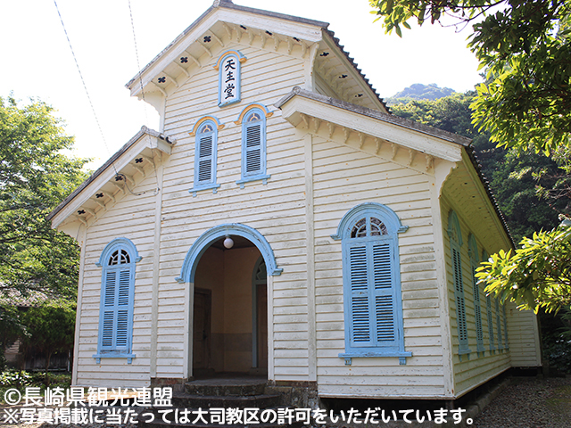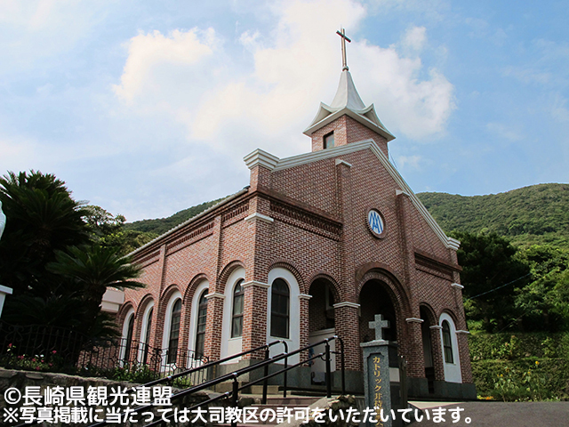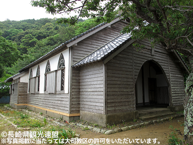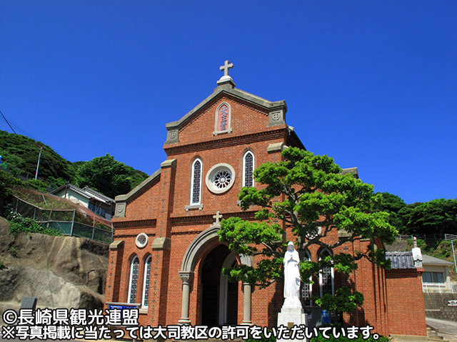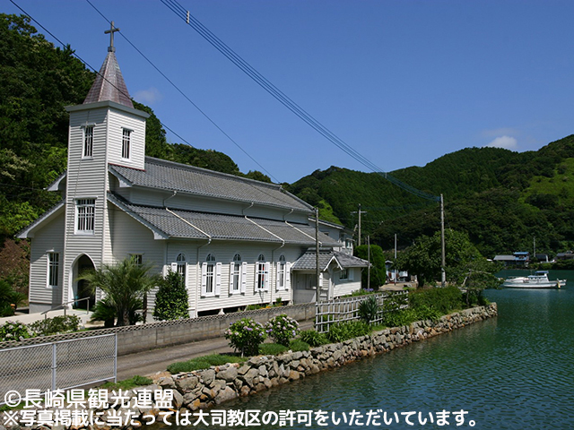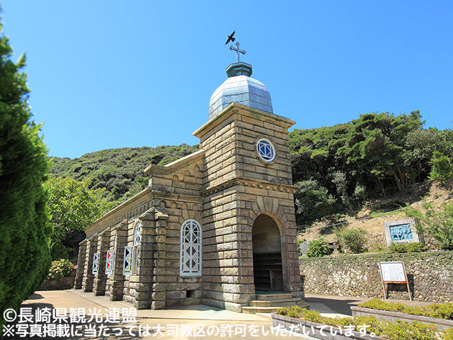 島の西の瑞、玉ノ浦の小高い丘に建つ教会。1895年にフランス人宣教師ペルー神父によって建てられたロマネスク様式の建築。聖母マリアの出現と「ルルドの泉」で知られるフランスのカトリック聖地を模した日本最古の「ルルド」がある。