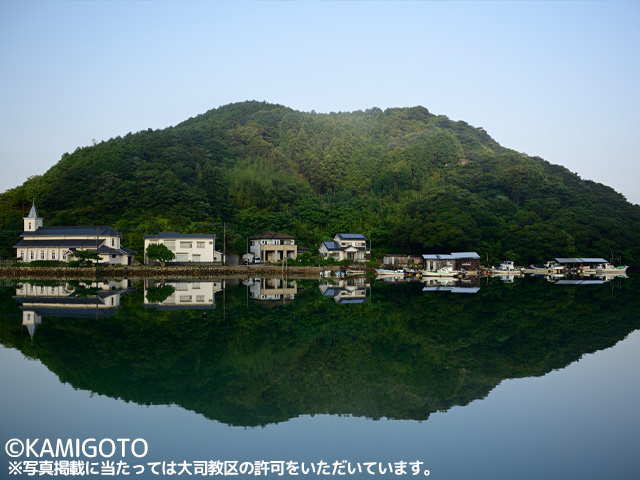 小さな入江のそばに建ち、入り江の水面に教会が映ることから別名「水鏡の教会」。1925年に建てられた木造教会で、二重にかさねた重層屋根、折上天井、祭壇部のみのコウモリ天井が特徴。花の時期、庭ではバラに囲まれた聖母マリア像が崇高な雰囲気を醸している。