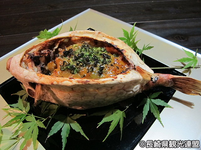 ハコフグの味噌焼きのことで、上五島に古くから伝わる郷土料理です。ハコフグの身だけを残し、味噌やねぎ・しょうがを入れてしっかりと焼き上げた風味豊かな味わい。一度食べたらクセになる珍品でインパクトもあります。