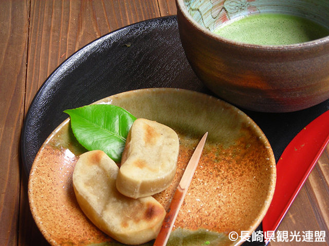 さつまいもを薄く切り、天日干ししたものともち米を一緒に混ぜてつきあげる島の代表銘菓。素朴で優しい甘さと絶妙のもちもち感が特徴。基本は棒状の餅を切って焼くだけ。「かんころ」とは五島列島の方言でさつまいものこと。