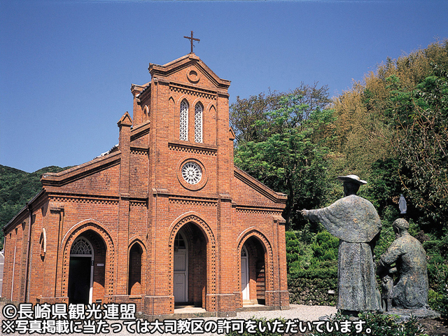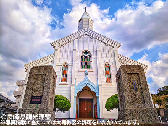 ロマネスク、ゴシック、和風建築が混合した白亜の美しい教会で、木造教会堂としては最大の規模を誇り、青空に尖塔がそびえる光景は絵になる美しさです。高台にはヨハネ五島(26聖人の内の五島出身者)の像や、弾圧時代の牢跡もあります。