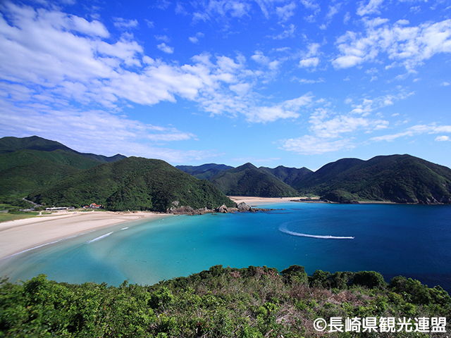 天然の海水浴場として「日本一美しい海」と称されることもある白砂のビーチ。日本の渚百選にも選ばれている。白銀色の砂浜と周囲を囲む山々の緑、東シナ海を望み一面に広がるエメラルドグリーンの海が造り出すコントラストは絶景。