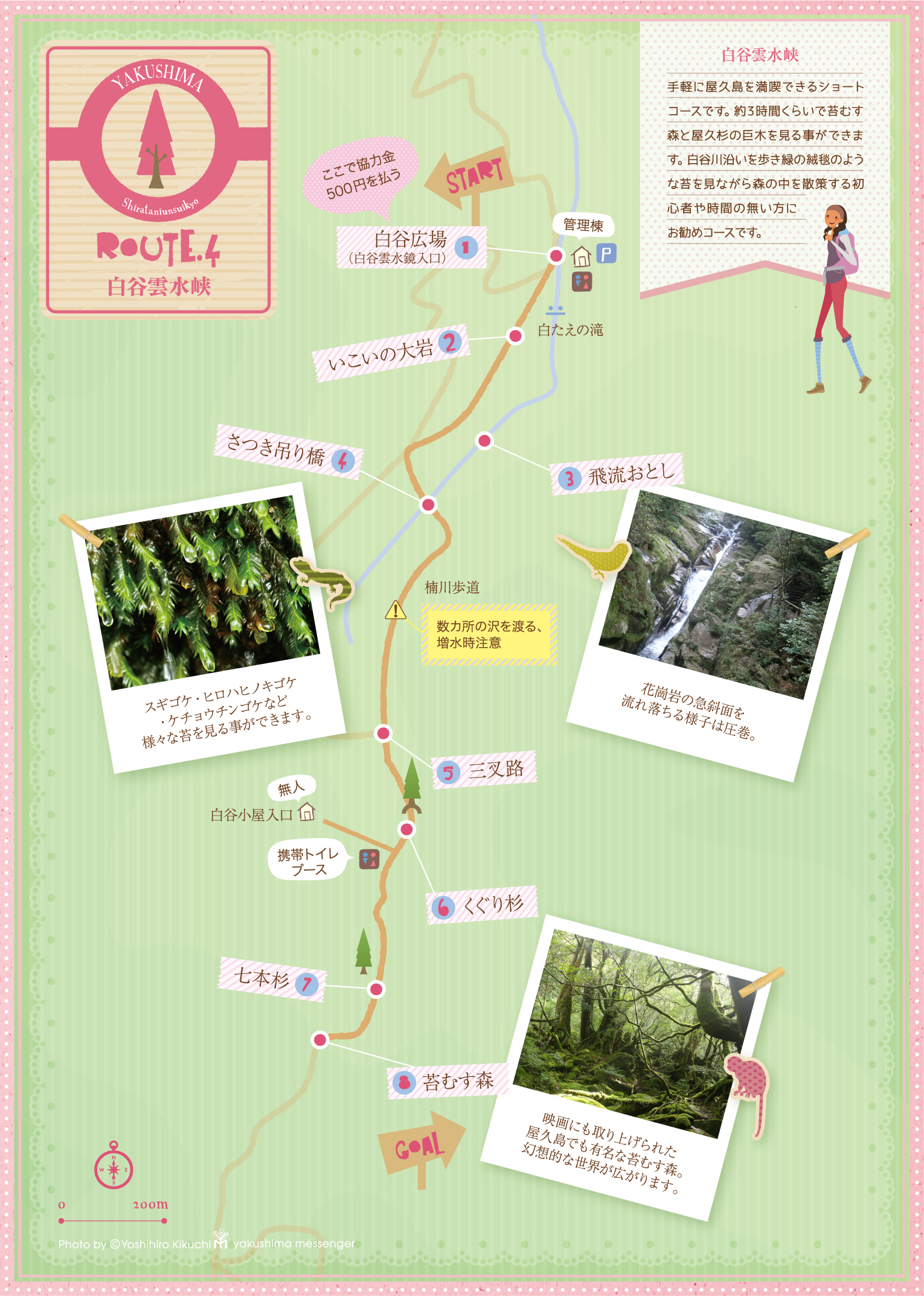 | 行 程 | お迎え(7:30~8:00頃発) → 白谷広場よりスタート ~ 約10分 ~ いこいの大岩 ~ 約10分 ~ さつき吊橋 ~ 約65分 ~ 三叉路 ~ 約5分 ~ くぐり杉 ~ 約10分 ~ 七本杉 ~ 約10分 ~ 苔むす森到着 ~ 復路 ~ 約70分 ~ 白谷広場 → お送り(12:00~12:30頃着) |