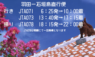 直行便はなんといっても楽ちん! 行きは約2時間半 帰りは2時間半をきっちゃいます! 沖縄にいくならうちなーの翼「日本トランスオーシャン航空」で!
