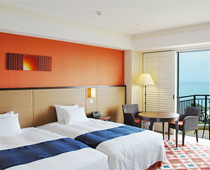 南国の太陽の光をテーマにした2つのデザインの客室をご用意(指定不可)各ウイングの5階以上のお部屋になります。バルコニーから海と中庭が眺められます。