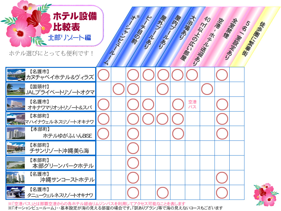ミネラル豊富な塩泉の大浴場や、プールなど、様々な施設、サービスが充実。美ら海水族館へも便利。