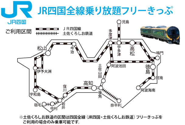 「JR四国フリーきっぷ」はJR四国線全線(宇多津~児島間を含む)の特急列車・普通列車の普通車自由席が乗り降り自由、「四国全線(JR四国・土佐くろしお鉄道)フリーきっぷ」はJR四国線全線(宇多津~児島間を含む)及び土佐くろしお鉄道線全線の特急列車・普通列車の普通車自由席が乗り降り自由です。ただし、伊予灘ものがたり、四国まんなか千年ものがたり、志国土佐時代の夜明けのものがたり、サンライズ瀬戸号には乗車できません。