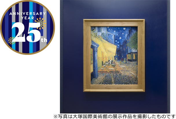 大塚国際美術館は、おかげさまで2023年3月21日に開館25周年を迎えました。これを記念し、3月14日(火)からオランダを代表する巨匠、フィンセント・ファン・ゴッホが描いた「夜のカフェテラス」を陶板で原寸大に再現し、追加展示しています。大塚国際美術館ではゴッホの7つの「ヒマワリ」をはじめ、今回の追加により計17点が一堂に鑑賞できます。