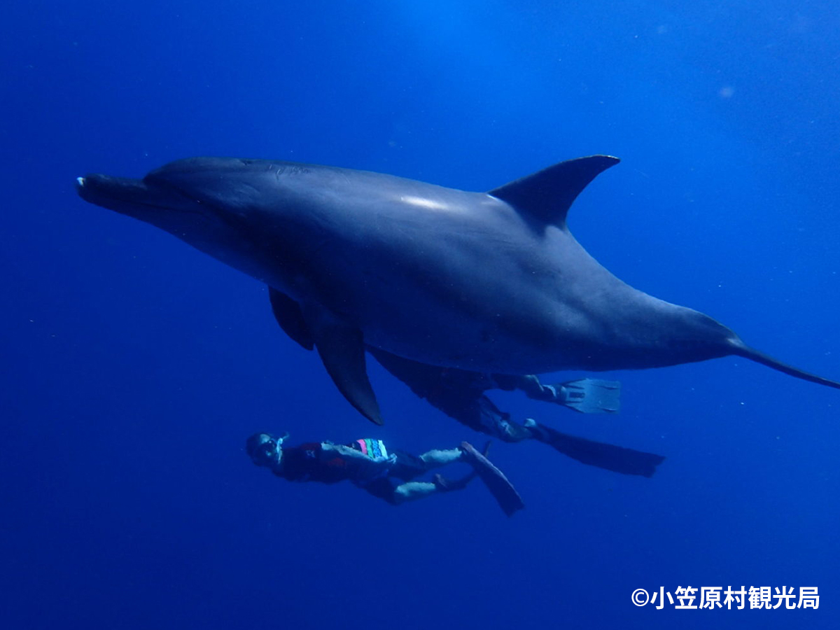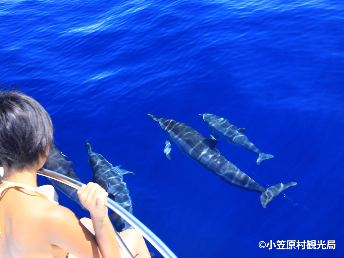 小笠原諸島近海では野生のイルカに一年を通じて出会うことができます。船からのドルフィンウォッチングではハシナガイルカが前転やバク転、ジャンプを見せてくれることもあります。ミナミバンドウイルカに出会えたら、ドルフィンスイムにチャレンジしよう。人と良く遊んでくれるので、フィーリングが合えば近寄ってくれるかもしれません。