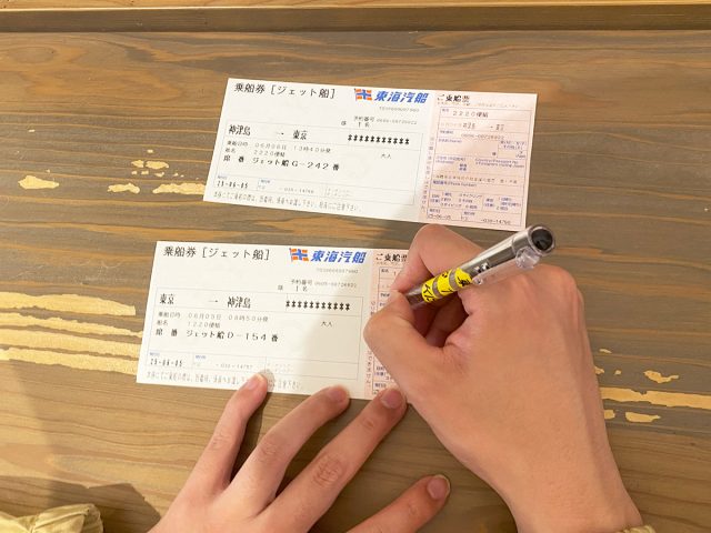 乗船券を受け取ったら、券の右側にある「乗船名簿」欄に名前や住所、連絡先などを記入します✍
