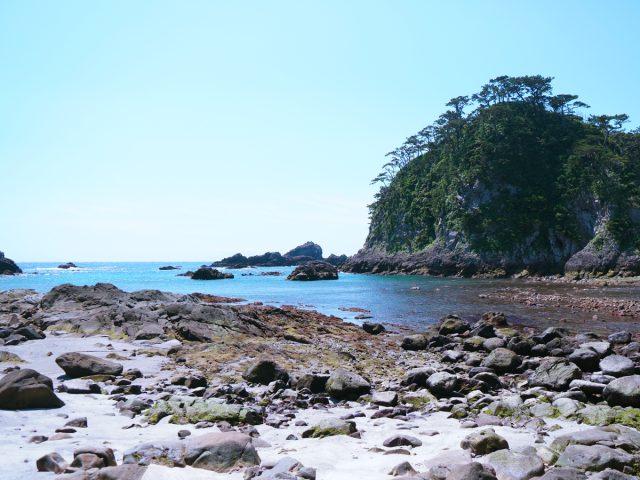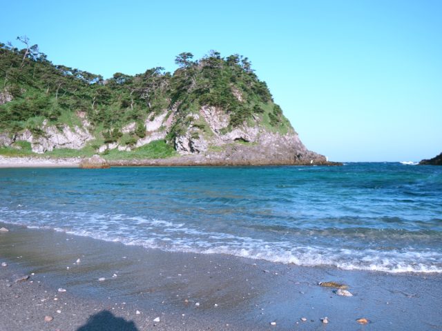 大浦海水浴場は、細かな砂浜と岩場が混在しており、海水浴だけでなく磯遊びも楽しめます。岩場の潮溜まりでは、カニや小魚などの海の生き物を観察することができ、家族連れに人気です。