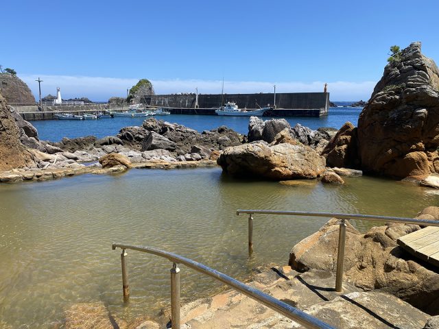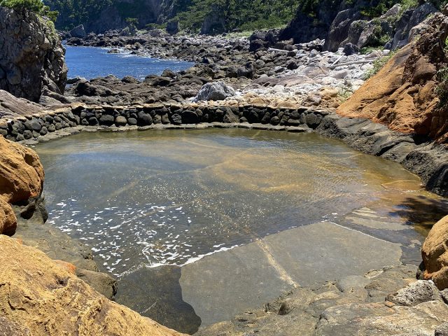 自然の湯船:海沿いの岩場に自然に湧き出す温泉で、潮の干満によって湯温が変化します。入浴前には、途中にある「湯加減の穴」で温度を確認するのがおすすめです。