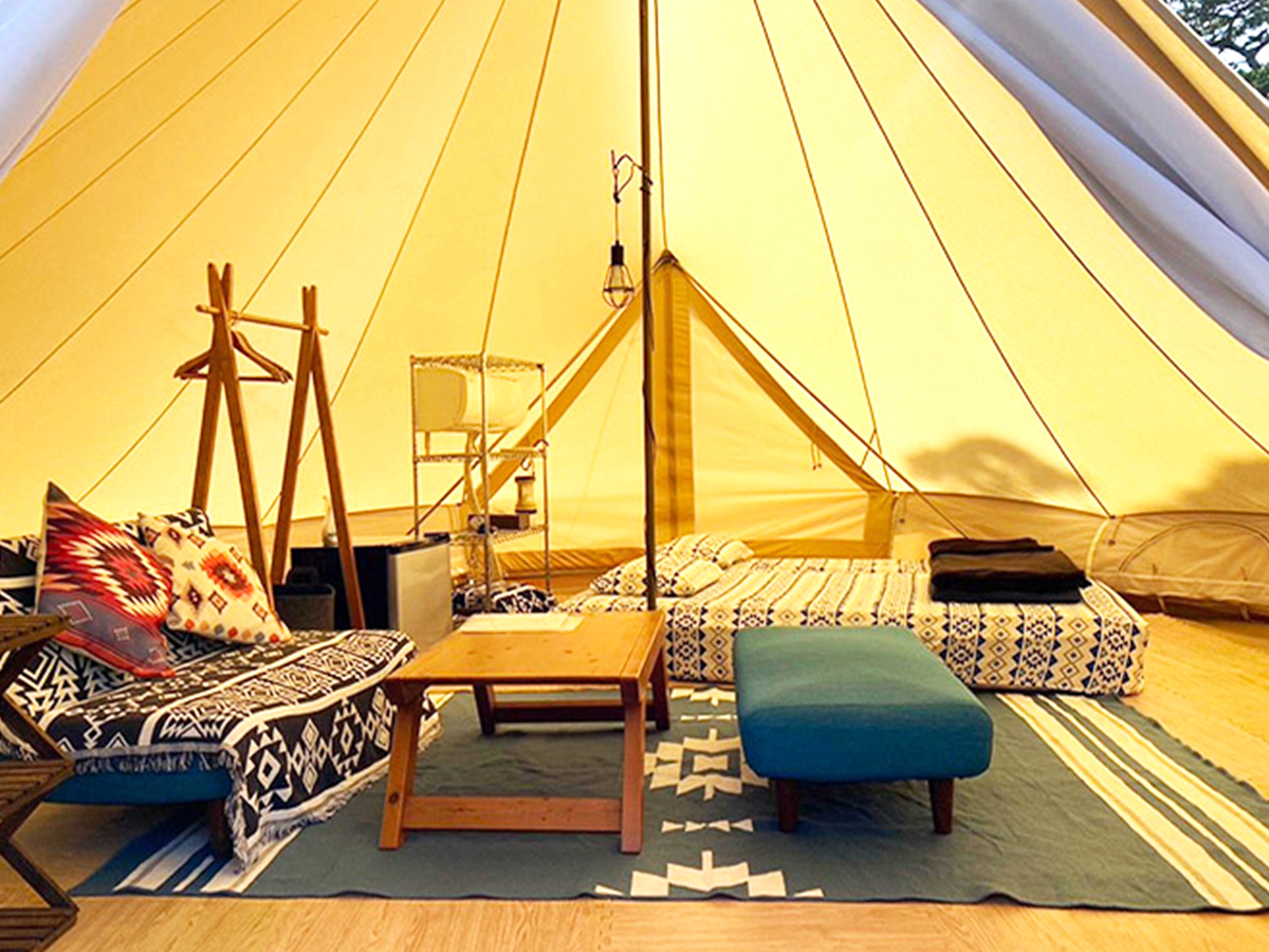 2018年にオープンした「凪グランピング」は、式根島の自然をより身近に感じることができる贅沢なグランピング施設。全室エアコン完備のテント内は可愛らしくデザインされ、アウトドアを楽しみながら快適な宿泊をご堪能いただけます。