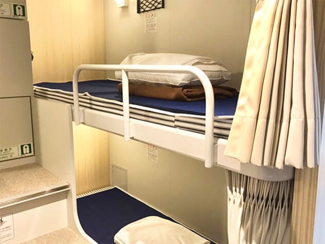 でもご安心を。各ベッドにはカーテンがついていて、着替えや就寝時も周囲を気にせず、自分だけの空間でリラックスできます。