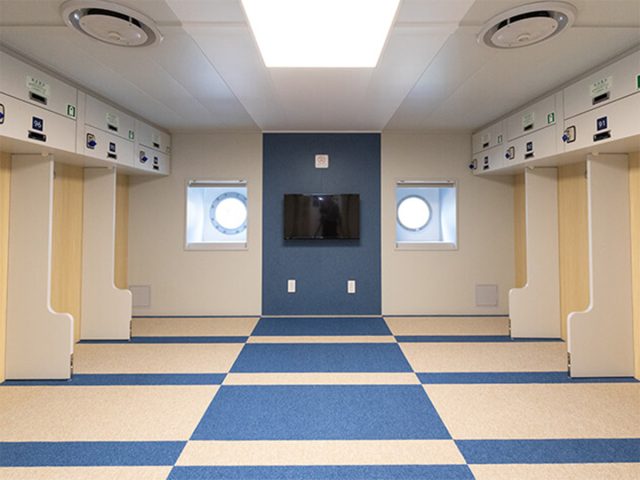 船内には、バリアフリー席も完備されたレストランや、さまざまな旅のスタイルに対応できる多彩な客室、旅の途中でリフレッシュできるコインシャワー、自販機コーナーなどを完備。さらに、お子さま連れでも安心のキッズルームや授乳室、車いすの方も快適に過ごせるようエレベーターや多目的トイレ、通路幅の広いバリアフリー設計が施されています。