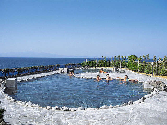 目の前に太平洋が広がる絶景の露天風呂「元町浜の湯」。晴れた日には遠くに伊豆半島や富士山を望むこともでき、まるで海と空に溶け込むような開放感が味わえます。特におすすめは、空と海が茜色に染まる夕方のひととき。心地よい潮風を感じながら、刻々と変わる景色に癒される贅沢な時間をお楽しみください。水着着用で利用できるので、気軽に立ち寄れるのも魅力です。