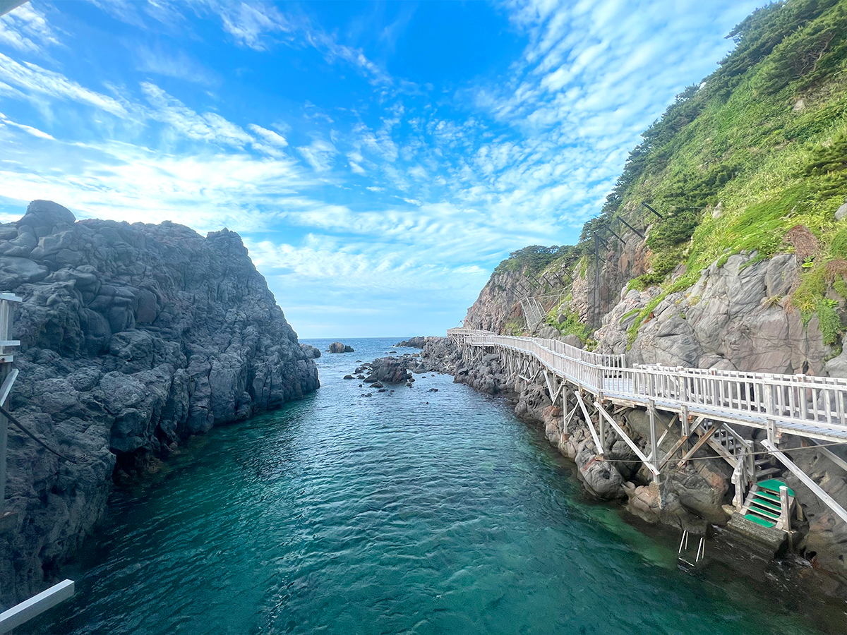 遊歩道は岩場に沿って設置されており、歩くだけでも冒険気分。ゆらゆら揺れる木の足場や自然の造形美を感じながら、海風を浴びて散策が楽しめます。途中には展望台もあり、そこからは新島や式根島、さらには伊豆半島や雄大な富士山の絶景が望めます。自然のパノラマビューに感動すること間違いなしです。