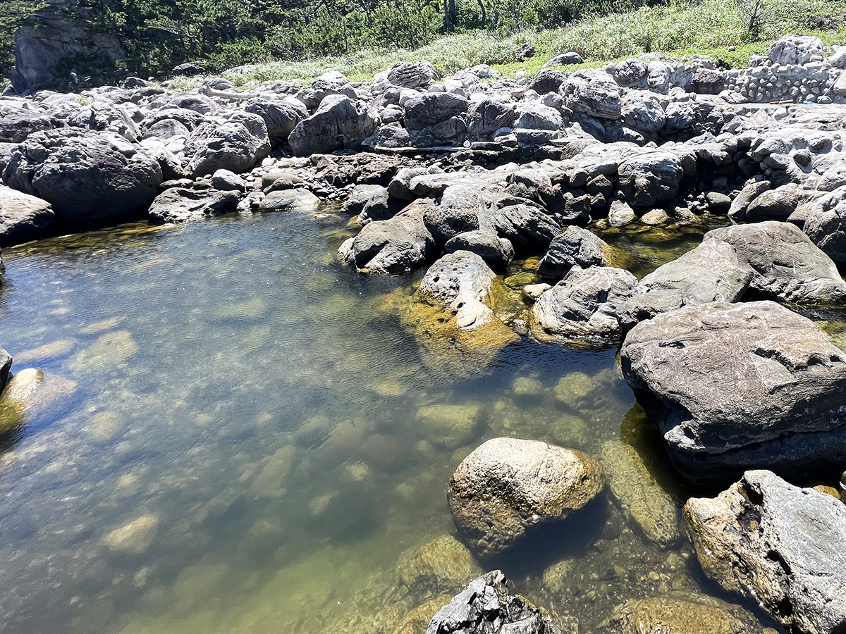 そこから、「足付温泉(あしつきおんせん)」に移動。海辺の岩場に自然に湧く、ひっそりとした雰囲気の野湯。ぬるめの湯に身をゆだねれば、やさしい波音と潮風に心がほぐれていきます。どちらも水着着用必須。シャワー設備はないので、温泉で温めたペットボトルのお湯が重宝します。