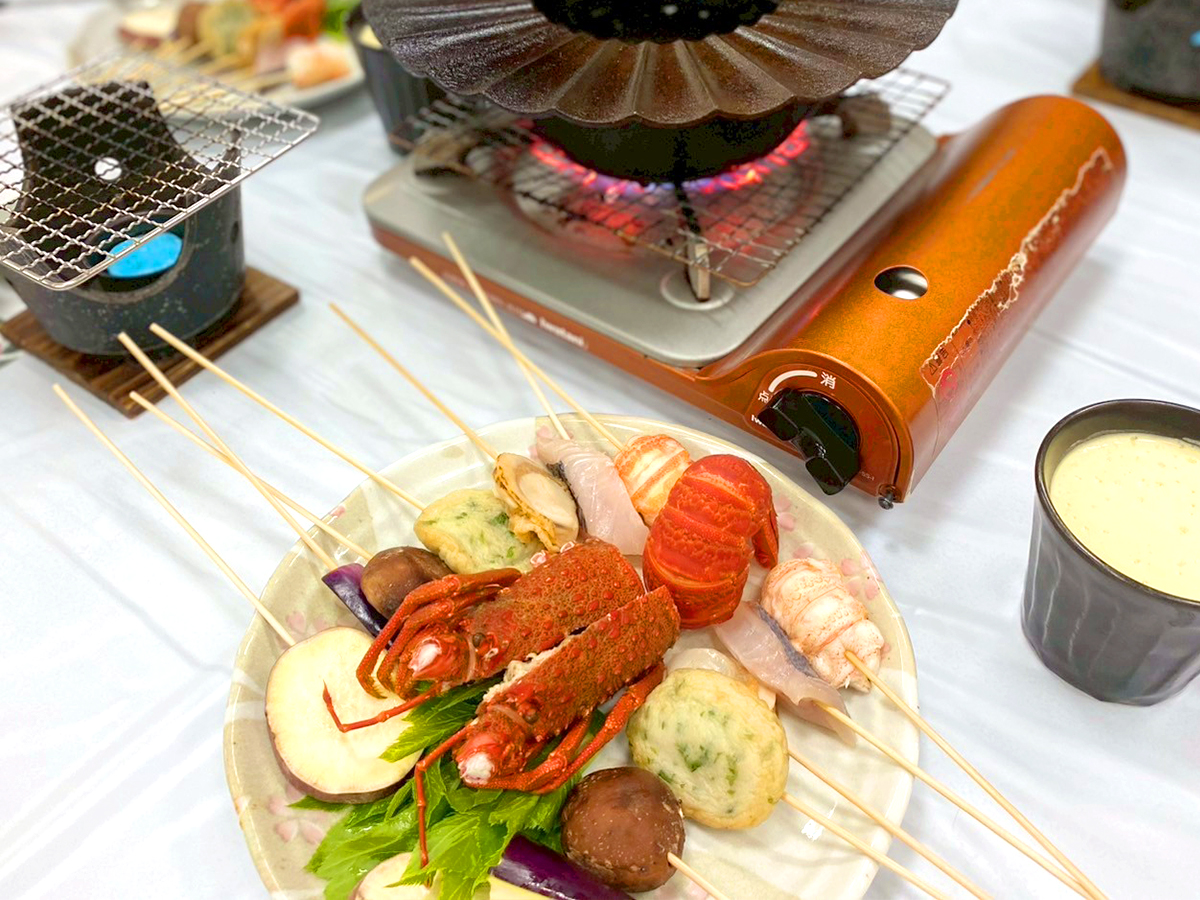 こちらは大島特産の椿油で揚げる名物料理「椿フォンデュ」。新鮮な魚介類をその場で揚げながら味わうことができる。