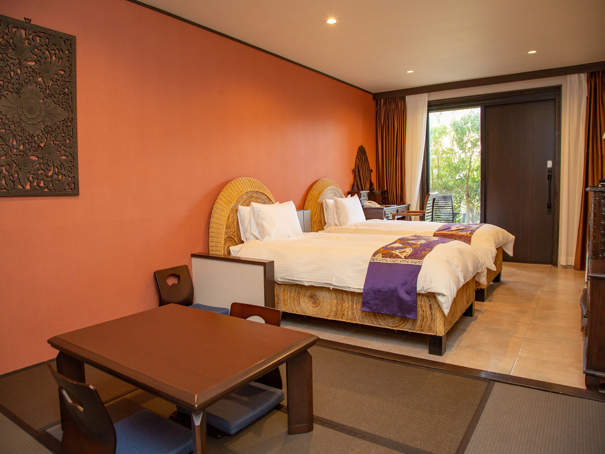 バリ島から直輸入した家具や調度品でしつらえた客室は、落ち着いた雰囲気ながらリゾート気分を盛り上げます。ベッドと畳の間がある和洋室は、1名から4名まで泊まれて女子旅にも大好評です。