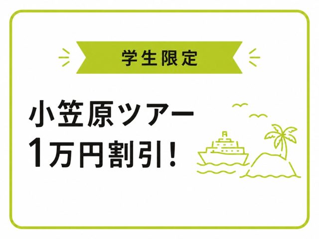 「一度は行ってみたい」と言われる世界自然遺産・小笠原諸島。でも、距離がある分「ちょっと高そう…」と感じていませんか? そんな学生の方にうれしいお知らせです。今なら対象ツアー限定で、お一人様あたり10,000円割引が適用できます! 学生旅行で小笠原がおすすめな理由 小笠原は、東京都でありながら海外のような大自然が広がる特別な場所。 ・透明度抜群の海でのシュノーケリングやダイビング・イルカやクジラに出会える感動体験・ここでしか見られない固有の動植物 普段の旅行では味わえない体験ができるのが魅力です。特に時間の取りやすい学生のうちに行くのがおすすめ。 学生割引の内容 対象の小笠原ツアーにご参加の学生の方は、お一人様あたり10,000円割引が適用されます。 ▼ポイント・同行者の中に学生がいればOK!・グループ旅行や卒業旅行にもおすすめ 学生割引の適用方法 学生割引は、以下の流れで適用となります。 ① WEBサイトより対象ツアーをリクエスト申込② 予約センターへお電話にて「学生割引利用」の旨をお申し出ください ※その際、「代表者名」と「リクエスト番号(数字2桁+7桁)」をお伝えください③ 学生証提出のご案内メールをお送りします④ メールにて学生証の画像をお送りいただき、確認後に割引適用 ※学生証コピーが必要です。(公共交通機関で学割料金が適用できる方が対象)※氏名・有効期限が確認できる、有効期限内の学生証の画像をご用意ください。 小笠原でしかできない体験を 船で約24時間かかるからこそ出会える、特別な景色と時間。その分、行った人の満足度がとても高いのが小笠原の魅力です。 学生の今だからこそ使えるこの割引で、一生に一度の体験をしてみませんか? 👉 学生割引対象の小笠原ツアーをチェック! ※一部割引対象外ツアーがございます。詳しくはツアーページ内にてご確認ください。