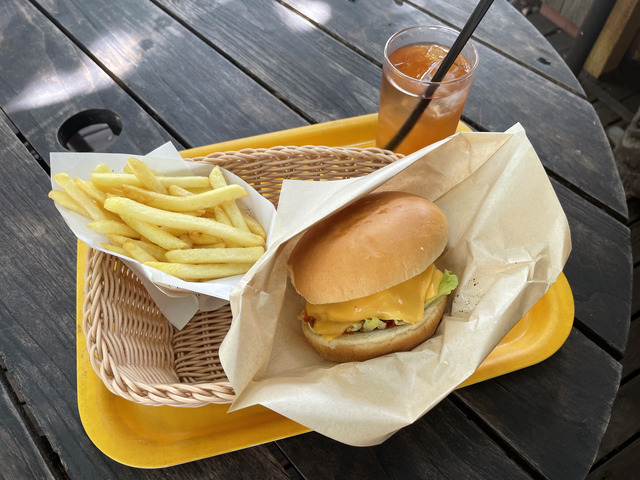 父島は強い日差しと湿度で、想像以上に体力を消耗することも…。 そんなときに立ち寄りたいのが、大村エリアにある「ハートロックカフェ」。観光の合間や、到着後すぐでも利用しやすい立地です。 席は室内とテラス席の2タイプ。その日の気分や暑さに合わせて選べます。 今回はお目当ての「サメバーガー」が売り切れ…!ということで、「チーズバーガーセット」を注文しました。 ハンバーガーもポテトもできたてであつあつ。短い時間でもサクッと食べられて、しっかりお腹も満たせました◎ テラス席はガジュマルの木の下。木陰に入ると風が抜けて涼しく感じました。外の暑さを忘れるくらい、心地よい空間です。 ランチはもちろん、カフェメニューも充実。ちょっと一息つきたいときにもぴったりです♪ お店情報 ■ エリア大村エリア(飲食店や商店が集まる中心地) ■ 住所〒100-2101 東京都小笠原村父島東町 ■ 主なメニューハンバーガー/カレー/コーヒー/デザート/お酒/ソフトドリンクなど ■ 利用シーンランチ、休憩、暑い日のクールダウン ※最新の情報は各自でご確認ください。