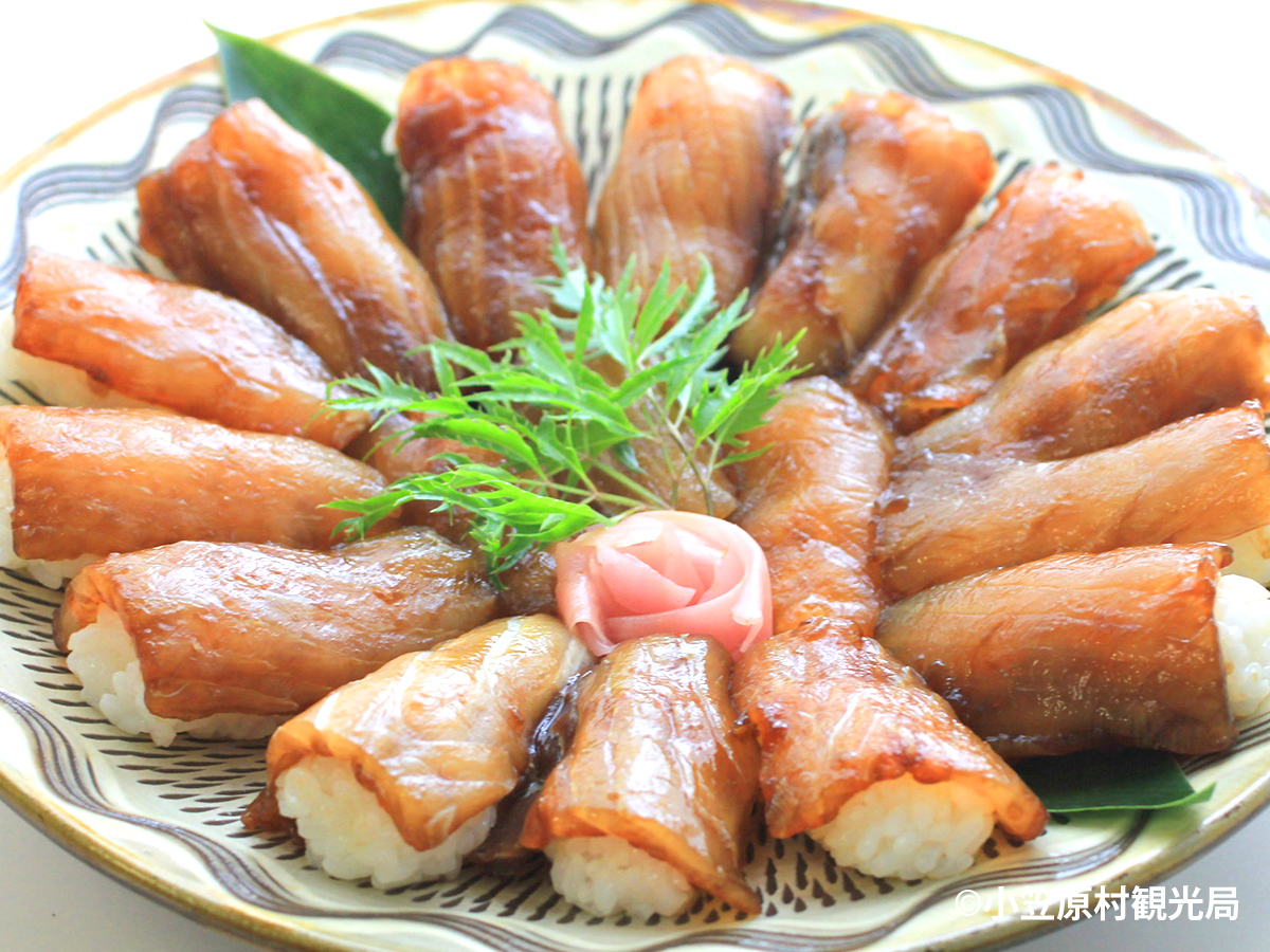 島ずしとはすしネタにする魚を薄く切って醤油ベースの液に漬けて、酢飯で握った小笠原諸島の郷土料理。小笠原諸島で獲れる魚をネタにしていることから島ずしとされ、東京ではこの漬けた製法で作られたネタを現在も「ヅケ」と呼んでいる。小笠原諸島ではサワラをそれぞれ「春トビ」と呼んで島ずしにして節分の日に食べる風習がある。春トビは春を告げる魚「春告魚(はるつげうお)」と呼ばれ、島ずしのネタとして各家庭で食されてきた。また、冠婚葬祭にも欠かせない一品。寿司だねを食べやすい大きさに切り、醤油、酒、みりんで漬けにする。砂糖と塩、酢で調味した酢飯で握る。すしの形態は各島々で独自に発達し、現在でも欠かすことのできない郷土食として人々に愛され続けている。