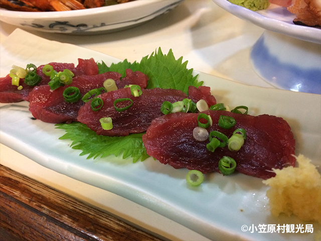 アオウミガメは現在、保護動物として指定されていますが、小笠原では歴史ある伝統食ということで、捕獲期間と捕獲頭数を定めてカメ漁が実施されています。小笠原ほど普通に流通しているところはないでしょう。島内飲食店の多くで、ウミガメ料理が食べられます。定番は刺身と煮込みです。独特の味わいでハマる人にはハマるようです。お祝い事やお祭り事がると振舞われる伝統的な郷土料理です。来島された際は是非、ご賞味ください。