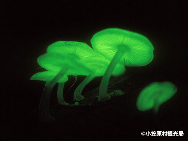 「光るきのこ」ことグリーンぺぺ、国内では温暖多湿な八丈島や小笠原諸島に自生するきのこです!小笠原では5月〜11月の雨上がりの夜、暗闇で光る神秘的な姿が見られます。この写真では実際より大きく見えますが、実物は1cmほど、小指の爪くらいのサイズです。ナイトツアーの目玉です。ナイトツアーでもこのグリーンペペを探しに行くことができる。ただし、ある場所に行けば必ず見られるものではなく、自然界に自生していてなおかつ3日ほどでその姿を消してしまうため見付けることはとても困難と言える。菌類のためジメジメした場所を好むので、梅雨の時期(6月ごろ)や湿気の高い時期・湿気の高い場所でなおかつ日が当たりにくい場所に生息している場合が多い。