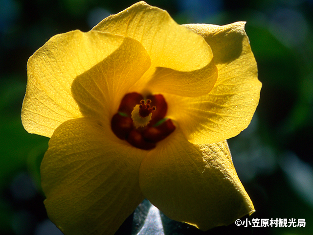 小笠原諸島の固有種で、学名の通り「ハイビスカス」の仲間です。黄色い花を咲かせる木を海岸部を除くあちらこちらで目にします。朝に黄色い花が開き、夕方になると赤くなって落ちてしまう一日花です。父島の山を歩けば、いたるところで見かけます。果実は一年中見られ、熟すと裂けて種子が飛び出します。テリハハマボウは、小笠原諸島の独自の生態系と進化の歴史を物語る貴重な植物です。その美しさと生態的な重要性を理解し、保全への意識を高めることが求められます。