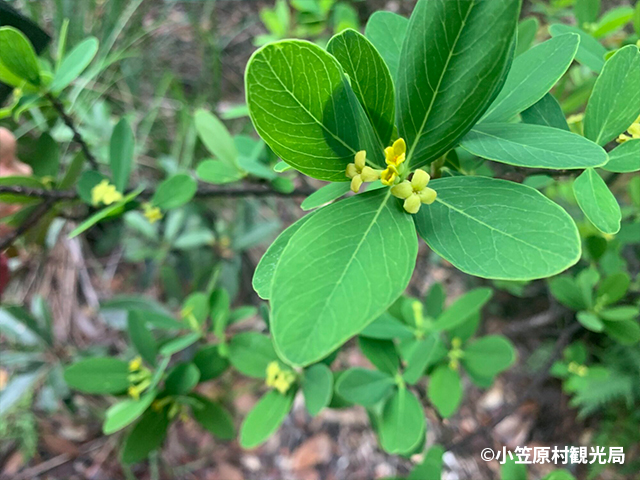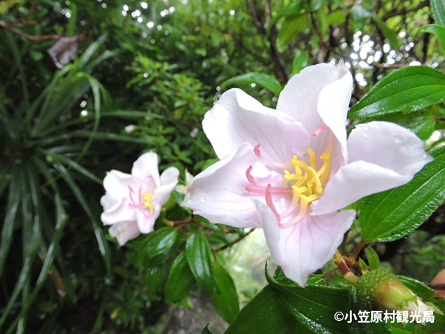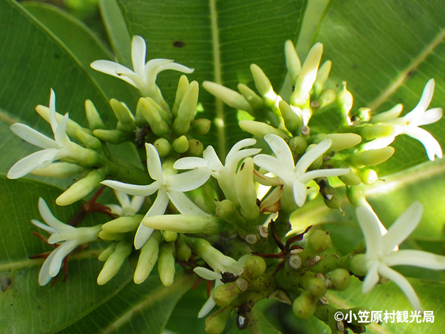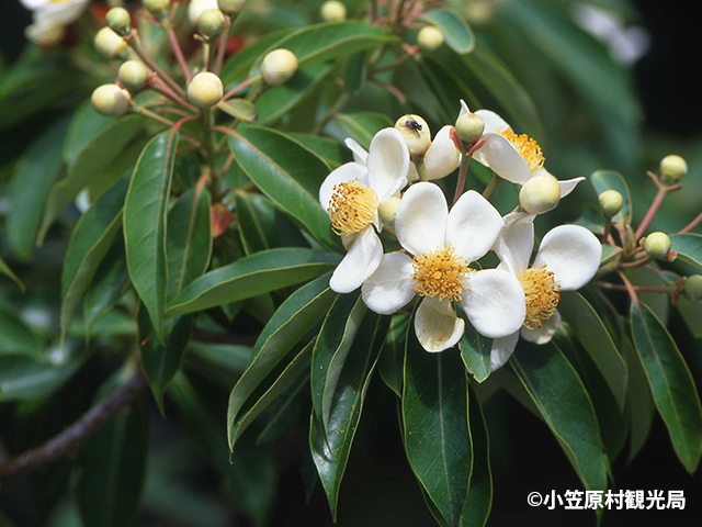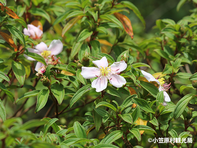 小笠原諸島の固有種であり、小笠原村の花に指定されています。小笠原諸島の島内に広く分布しており、山地の中腹などで生育します。花期は5~6月頃、木によっては8月頃まで花をつける事もあります。花が終わると果実がふくらみ、大きさは1センチほどの球形となります。長い柄の先についた球形の果実は、11月頃に種子をはじき出します。