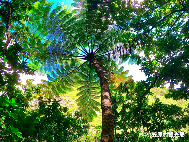 父島の中央部から南部にかけての湿った林内・林縁や沢沿いにかけて木生シダが多くみられます。また母島へでは多数のマルハチがうっそうと茂る森の樹冠から突き抜ける姿は南国的で美しいです。幹はときに10メートルを超え、森の中のタワーか巨大なオブジェのようです。