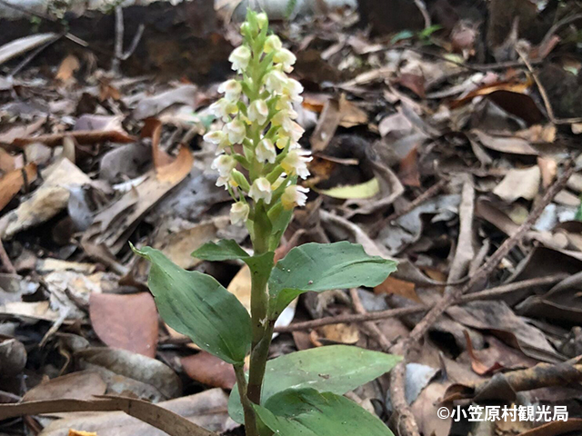 葉は濃緑色で長卵形。3~5枚の葉をつけ、葉先は尖る。花期は、10月~1月頃。薄暗い湿った林内の環境を好み群生します。ムニンシュスランは、人に踏まれると雑草とは違い容易く枯れてしまいます。東平サンクチュアリー内の道に多かったムニンシュスランは、ずいぶん数が減りました。