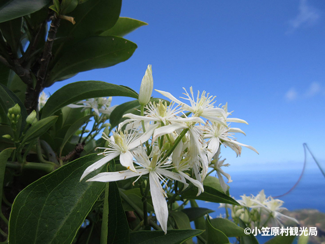 9月半ばを過ぎる頃、白い花をたくさんつけたムニンセンニンソウを見ることができます。ムニンセンニンソウは蔓性の多年草で、枝先に近い葉のわきから伸びた花の軸に花弁に似た4枚の白いがく片とたくさんの雄しべが目立つ花を咲かせます。約3センチほどの大きさの十文字形の花が固まって咲きます。ムニンセンニンソウは、父島と母島だけにあり、属島にはないといわれています。