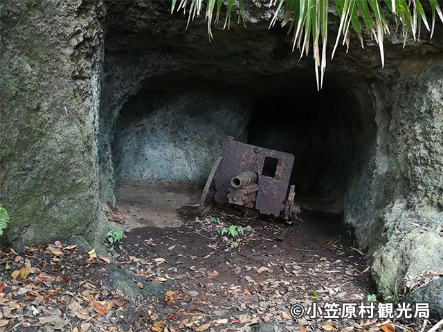 まずは固有種オガサワラビロウが生い茂る森の中を進み、少し歩くと洞窟の中に身をひそめるかのように佇む、小さな大砲や旧日本軍が残していった食器や一升瓶まで残っていて夜明山陣地で生活していた形跡を見ることができます。さらにジャングルを進み洞窟探検!真っ暗なので懐中電灯を借りて進んでいくと中には第二次世界大戦中に、対空激戦に備え配備された八八敷七糎野戦高射砲(はちはちしきななせんちやせんこうしゃほう)があります。洞窟を後にし、岩場を登ると、突如絶景は広がります。手前に境浦海岸・左右に扇浦海岸、大村海岸と大パノラマがご覧いただけます。