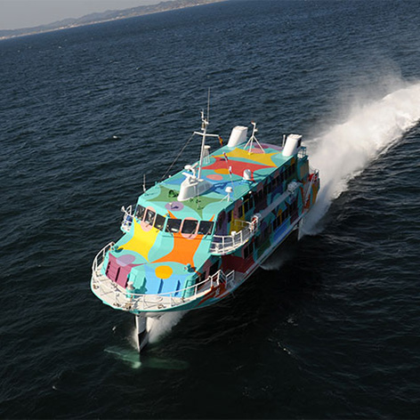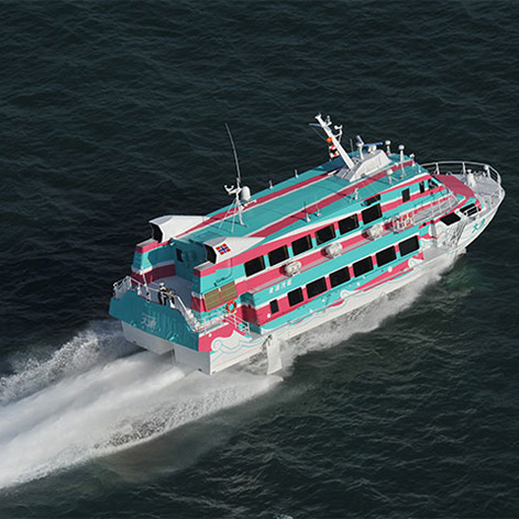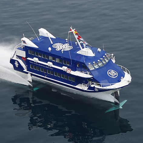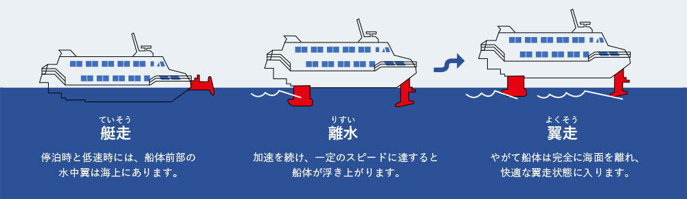 水中翼で浮き上がって航行するため、船体への海水の抵抗が少なくなり、時速約80kmのハイスピードを実現。しかも波の影響を受けず、ほとんど揺れません。船酔いの心配を解消しました。