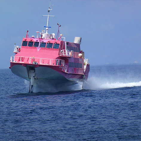 高速ジェット船セブンアイランドの正式名称はジェットフォイル。アメリカの航空機メーカーが開発した船で、ジェットエンジンで海水を吹き出し、空気のかわりに海水から揚力(浮き上がる力)を得て飛ぶ「海のジェット機」です。