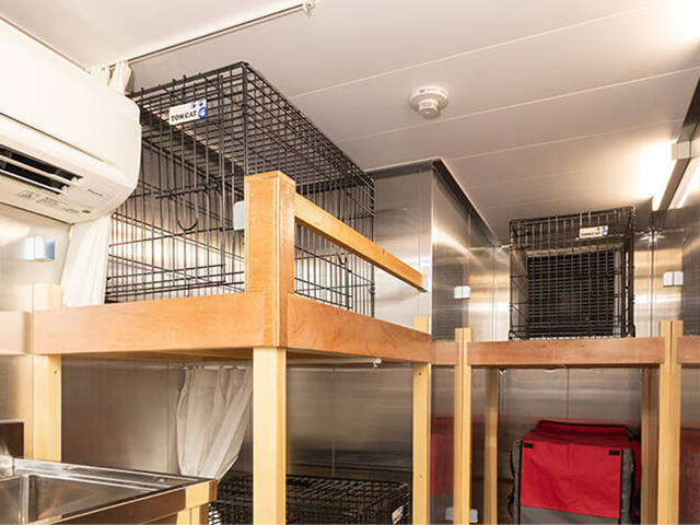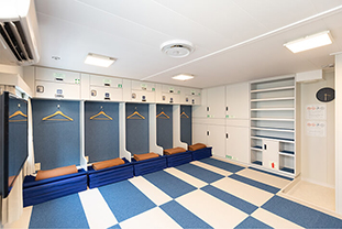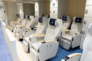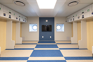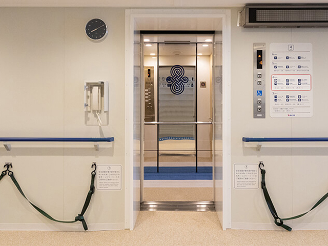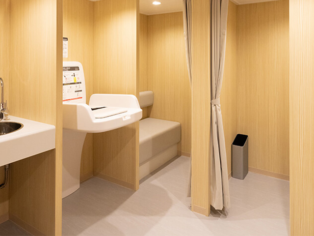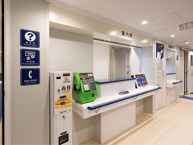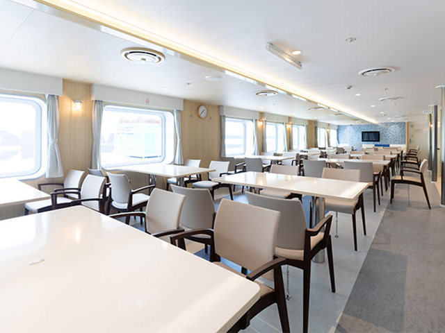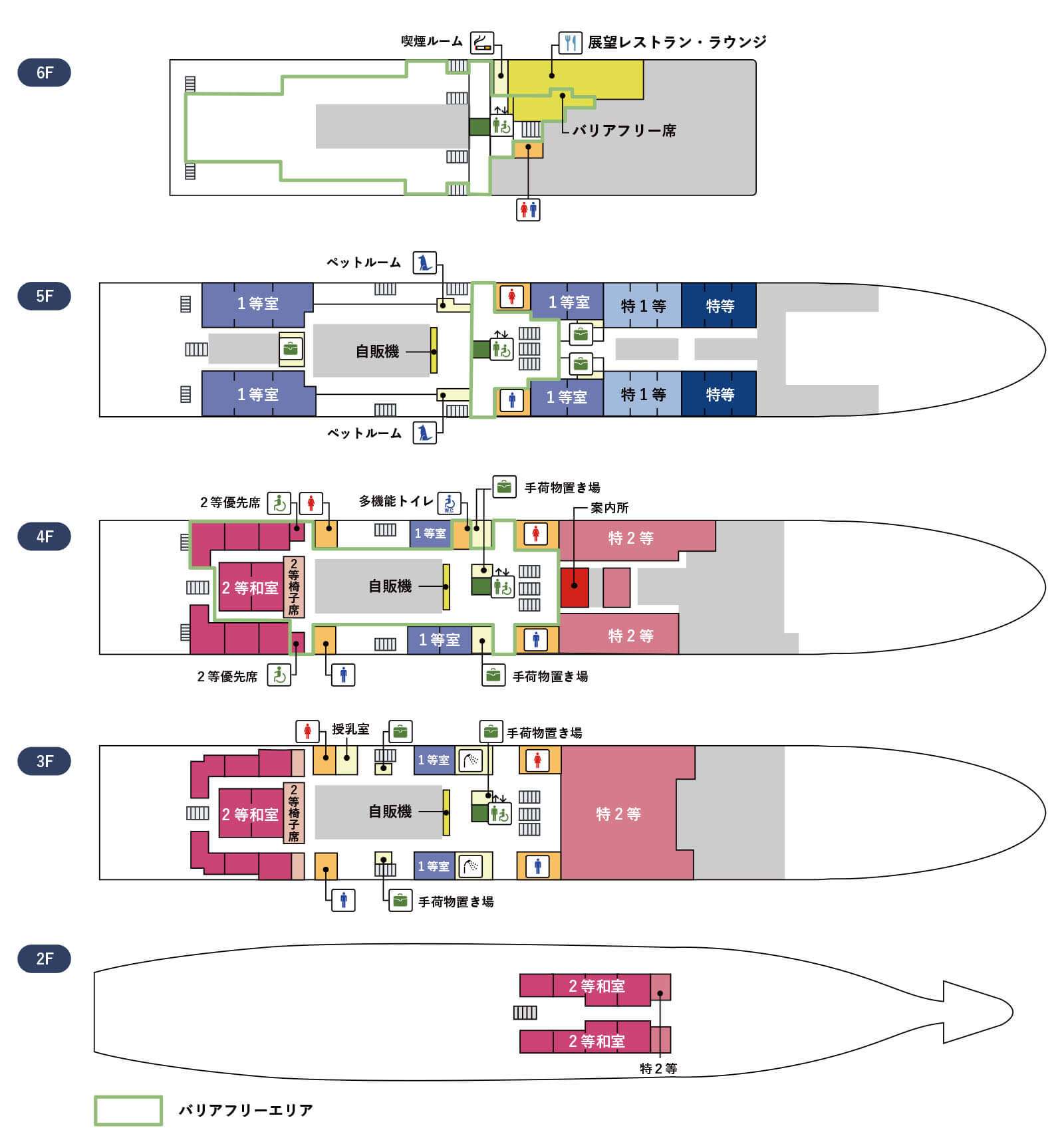 2等優先席、多目的トイレ、船内エレベーターを設置。車椅子のお客様用に広い通路幅と車いす置き場スペースがあり、レストランには車いすのままご利用いただけるバリアフリー席が設置されています。