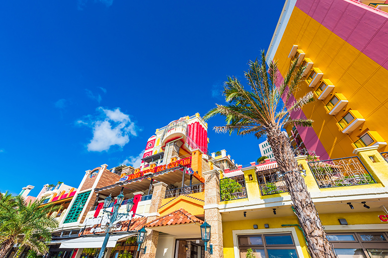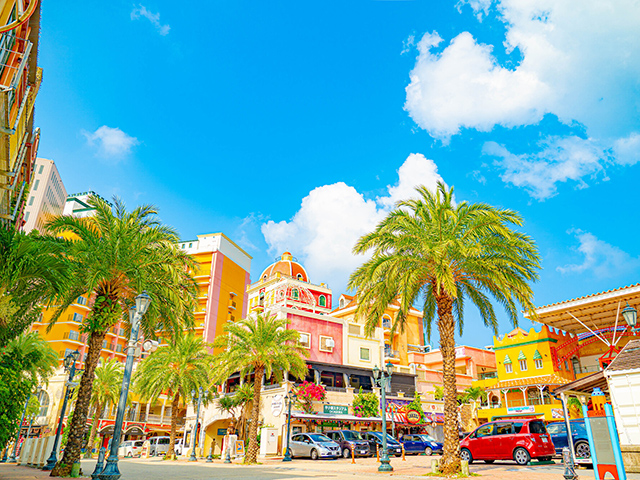 本島中部の西海岸に位置する北谷町は、米軍基地が近いこともあり、異国情緒あふれる街並みが広がります。沖縄ならではの美しい海や爽やかな青空が広がり、まるで海外に来たかのような景色に出会えます。