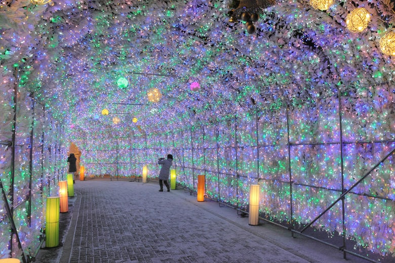 冬の洞爺湖を彩る光の回廊。温泉街の中心部にある広場に約40万球の電飾が輝き、ロマンチックなトンネルを作り出します。雪景色の中でキラキラと輝くイルミネーションはとても美しく、寒さを忘れて写真を撮りたくなるスポットです。
