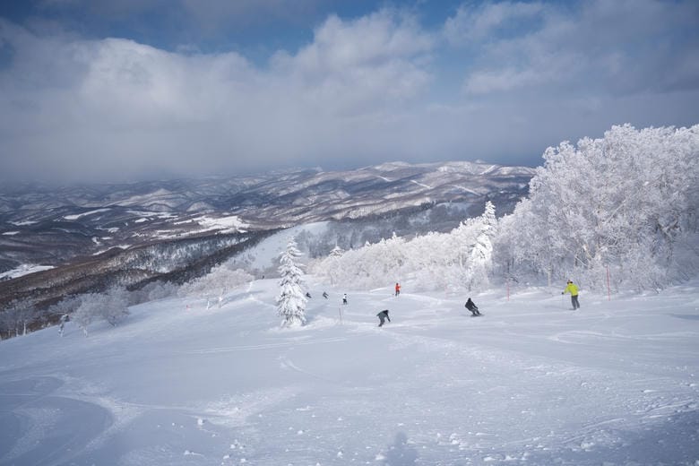 函館市内から車で約50分。日本最長クラス(3,319m)のゴンドラがあり、山頂まで快適にアクセスできロングライドが楽しめるスキー場です。目の前にそびえる駒ヶ岳の雄姿と、木々に付く美しい「霧氷」のトンネルを滑り抜ける体験は感動的。函館の朝市や夜景観光とセットで楽しめます。