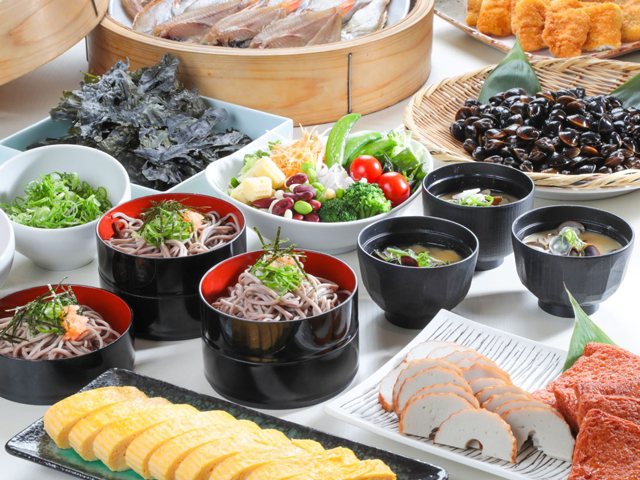 食だけでなく、目からも島根らしさを感じる空間を提案。メインエリアに、松江城下町の雰囲気をインテリアで表現し、個室ごとに、隠岐・出雲・石見といったテーマを持たせ、レストラン全体で魅力あふれる島根を表現。朝食は山陰の食材「穴子」「のどぐろ」などに加えて、「出雲そば」「しじみの味噌汁」「赤天」などの郷土料理、充実のサラダコーナー、卵料理、肉料理、惣菜、カレーやパンなど幅広いメニューを、和・洋ブッフェスタイルでお楽しみください。