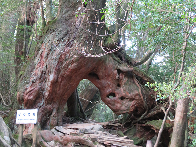 名前の通り、巨大な屋久杉の根をトンネルのようにくぐる、くぐり杉。四方に分かれた根が根の下を人がくぐれるほどに地面からせり上がり、登山道自体がくぐり杉の下を通るようになっています。