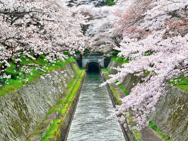 琵琶湖疏水は、琵琶湖の水を京都へ繋げようと明治時代に整備されました。その取水口がこの琵琶湖第一疏水です。第一トンネルには伊藤博文が揮毫した「氣象萬千」という言葉が掲げられています。現在、疏水の周りには桜並木が植えられており、毎年春になると多くの人の目を楽しませています。おだやかな水の流れを楽しめる場所としても、琵琶湖から三井寺を繋ぐ散策路としてもおすすめなスポットです。